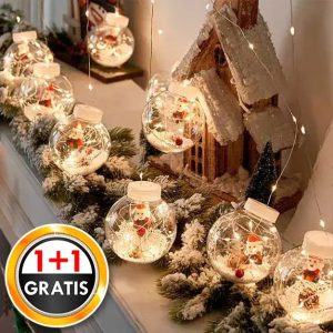 Průhledné koule obsahují roztomilé figurky, umělý sníh, šišky a LED světýlka.